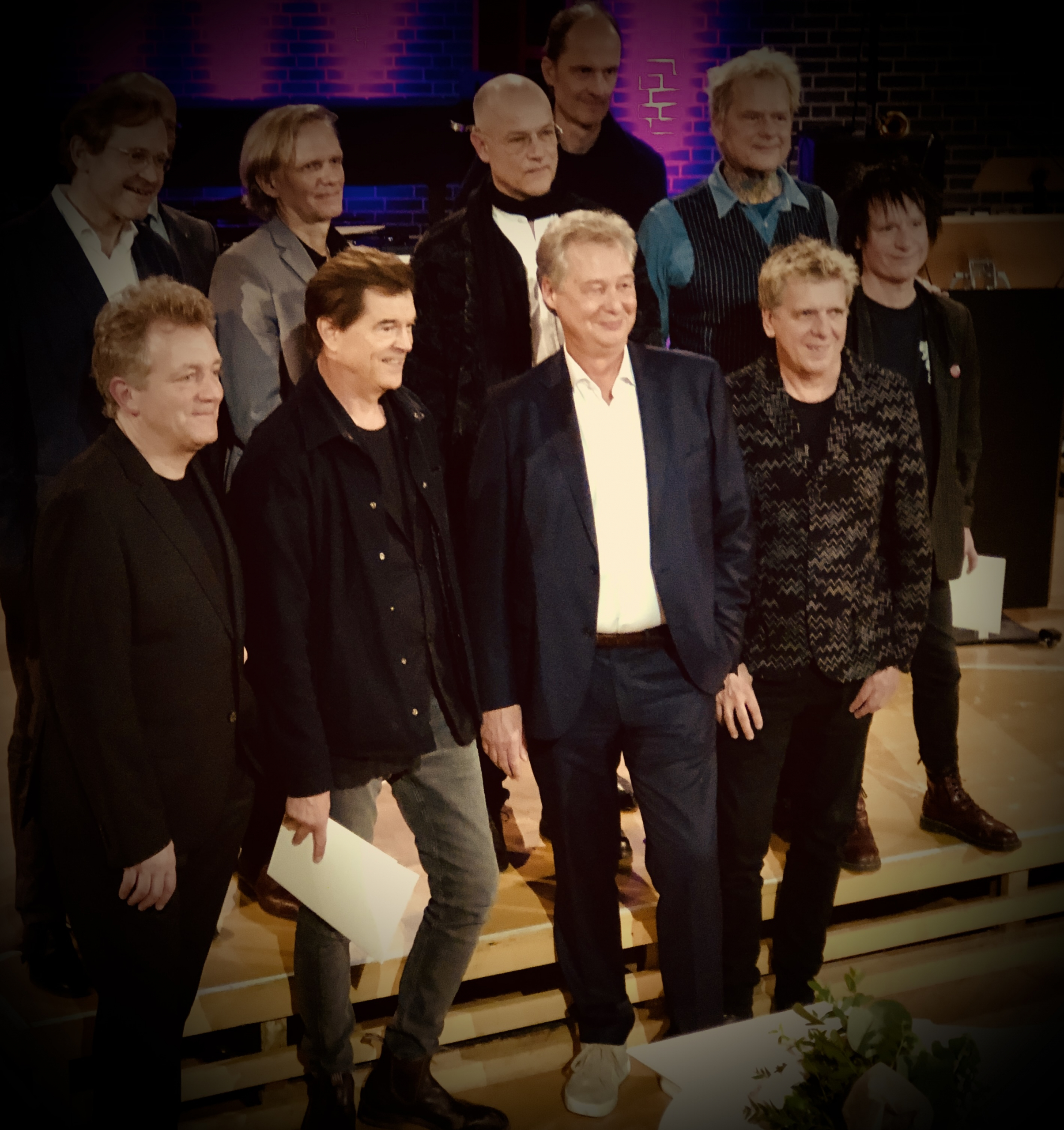 Am gleichen Abend erhalten die Toten Hosen die Ehrenmitgliedschaft, mit der die außergewöhnliche Zusammenarbeit zwischen Hochschule und Band gewürdigt wird. Auf dem Foto in der ersten Reihe zu sehen: Tobias Koch, Campino, Rektor Prof. Thomas Leander, Andi und Vom Ritchie.